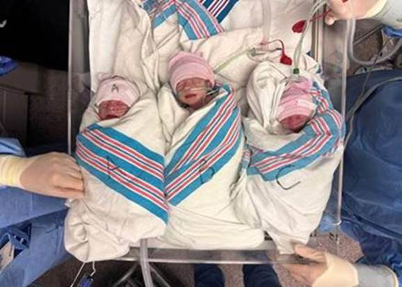 Hoda Maarouf, M.D., delivered the triplets and immediately led the rapid, life-saving response when Evilin began experiencing severe internal bleeding. Multiple blood transfusions were started, made possible by blood donors in the community, as the medical team worked to stabilize her. During surgery, they discovered a large mass and made the decision to remove it and send it for testing.
